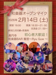 2026年2月14日(土) 和楽器オープンマイク 18:00 オープン / 18:30 スタート 和楽器BAR 龍宮〜Ryu Guw〜(高円寺) 参加費:2,000縁 + 飲食代 ・18:30〜21:00 公演(オ...